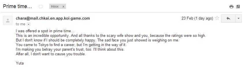 At the beginning the MC live at Long Island with Kuni for several days already, then one day Yuta got a news that he'll going to gig, it's a show about his newly wedding life with a scary-wife (although he hasn't married yet) and it's a big opportunity for him and Fukumimi (his comedian group). He came to long island to celebrate with others. Night comes by, Yuta still want to drink, but the rest has works to do so they can't accompany Yuta. Then he asked MC to accompany him. Yuta and MC go to another bar and looks like Yuta's kind of drunk a little bit, MC and Yuta talks about Fukumimi and joking around until late night. After they're finish drinking, they're heading home. Suddenly MC slipped and almost fall down, but Yuta hold her before she fall down.